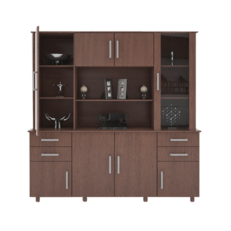 Modular de 8 puertas, 4 cajones y estantes en su interior. Fabricado en melamina, color wengue.