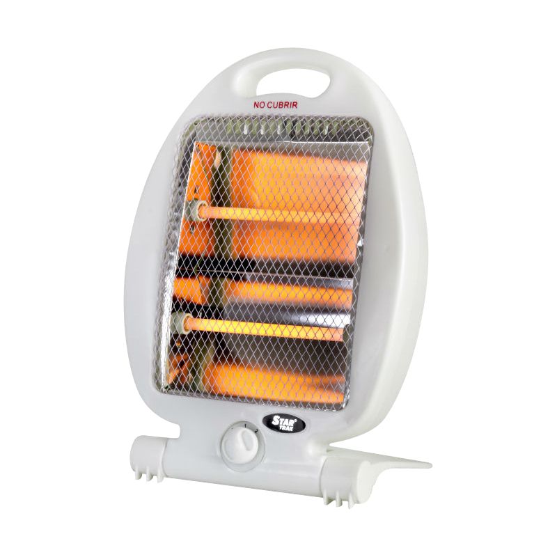 Estufa eléctrica infrarroja de 2 velas. Niveles de potencia de 400 y 800 watts. Soporte de base rebatible y manija superior para traslado. Con dispositivo de seguridad corte por caída.