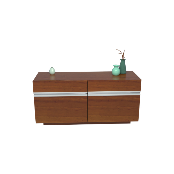 Mesa de TV con cuatro cajones. Fabricada en melamina, con detalles en aluminio. Color caoba.