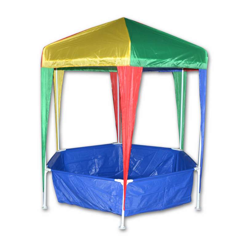 Gazebo infantil con pileta incluida. Confeccionado en lona de vivos colores, con estructura de caño revestido en epoxi blanco y uniones de plástico reforzado. Formato cxagonal.
